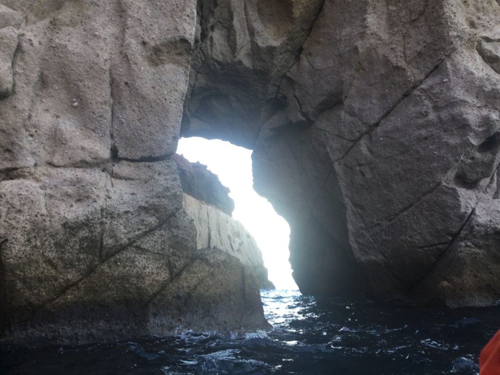 Luego nos lleva al lugar donde los pericués rendían honor y tributo a su dios. No podemos bajar, pero a lo lejos, entre rocas desgastadas a golpes de olas, está el rostro o la máscara de ese dios que los protegía -cuenta Manuel- de la furia del mar.